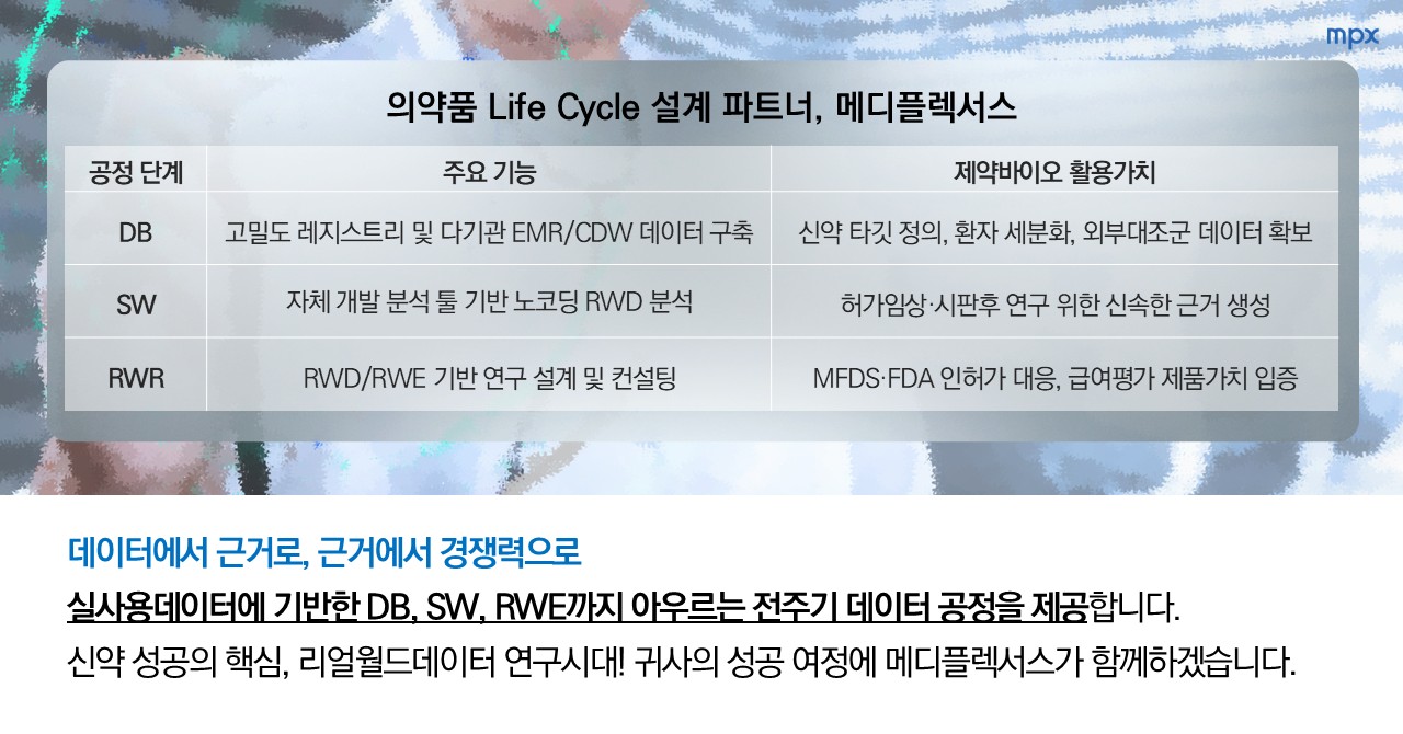 메디플렉서스는 RWD/RWE 기반으로 기획–임상–허가–급여–시판후 전주기를 한 흐름으로 연결합니다.